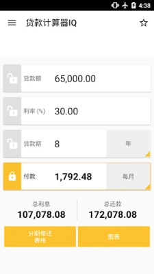 "贷款计算器IQ"的强大之处远不止于此。除了核心的每月还款额计算,它还赋予您前所未有的灵活性。您只需提供任意三项已知数据——例如贷款金额、还款期或预期利率,系统便能智能反算出其余未知项。这意味着,您可以轻松计算出精确的月度或年度还款额、银行实际收取的利率、贷款总额,乃至最适合您的贷款期限。无论是住房、教育还是汽车贷款,复杂的财务谜题都将迎刃而解,让您对未来充满掌控。